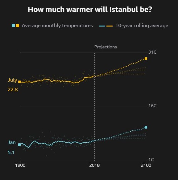 Şuan için İstanbul'un Temmuz ayı ortalama sıcaklığı Meteoroloji Genel Müdürlüğü verilerine göre 23,8 derece. Yani insanlık bu şekilde her şeyi tüketerek devam ederse ve en kötü senaryo gerçekleşirse 2100 yılında şuan ki ortalama sıcaklıktan 5,4 derece daha sıcak bir İstanbul olacak.
