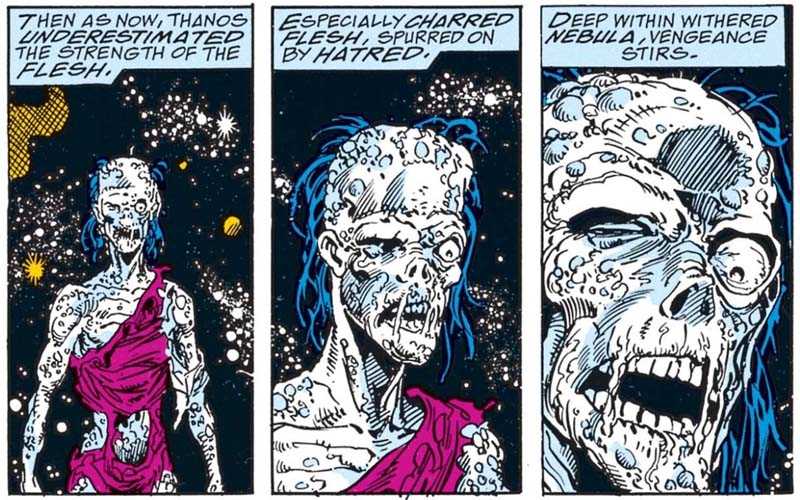 Thanos’un acımasız olduğunu anlamak için pek çok sebep var. Filmde de bu sebeplerden biri de üvey kızı Nebula’ya işkence yapmasıydı. Thanos’un üvey kızı olan Nebula’nın bu filmde yer almaması oldukça sürpriz olurdu çünkü Infinity Gauntlet filminde Nebula, önemli bir konumda yer alıyordu. Infinity Gauntlet’in sonunda Thanos’un elinde bulunan Sonsuzluk Eldiveni, Nebula’nın eline geçiyordu. Filmde bu sekansı görmedik tabi ama Nebula’nın içinde bulunduğu bir çizgi roman referansı da bulunuyordu. Ruh Taşı’nın yerini öğrenmek için Gamora’yı kaçıran Thanos, Gamora’dan bilgi alabilmek için Nebula’yı kullandı. Üvey kızına işkence yapan Thanos, Infinity Gauntlet çizgi romanında da bunu gerçekleştiriyordu. Filmde yaptığı işkence ne kadar acı verici olduğunu hissettirse de çok fazla acımasız görünmüyordu. Ancak çizgi romanda Thanos, Nebula’ya adeta cehennemi yaşatmıştı.