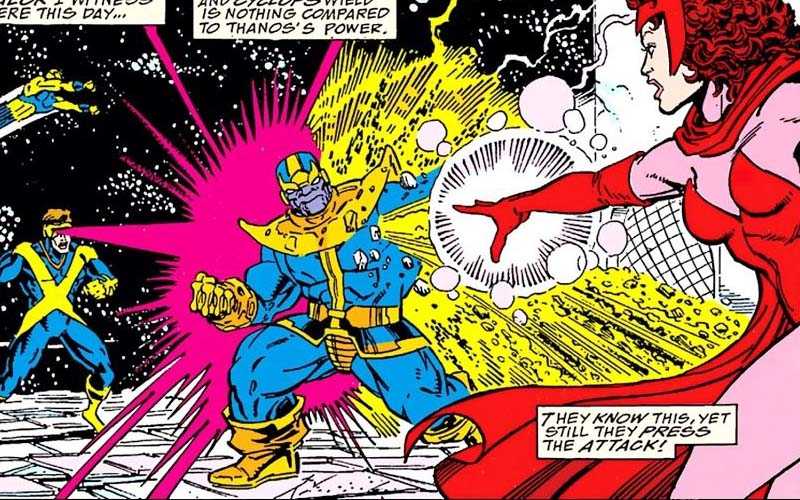 Filmin sonunda Scarlet Witch ve Thanos’un karşı karşıya gelme sahnesi de Infinity Gauntlet hikayesindeki panelleri andırmaktaydı. Ancak filmden farklı olarak Cyclops da o sırada Thanos’a saldırmaktaydı. Bu farklılığın sebebi ise tahmin ettiğiniz üzere değil sadece Cyclops’un, X-Men’in sinematik evren dahilinde yer almaması. Çok şükür ki şu