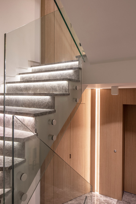 2 tane normal ve 1 tane dubleks konuttan oluşan projede minimal bir renk paleti kullanılmış. Beyaz, gri ve açık renk ahşap tonlarının hakim olduğu dekorasyon, temel geometrik formlu yüzeyler ve hacimlerle bütünleştirilerek açık, havadar ve modern bir iç mekan tasarımı elde edilmiş.