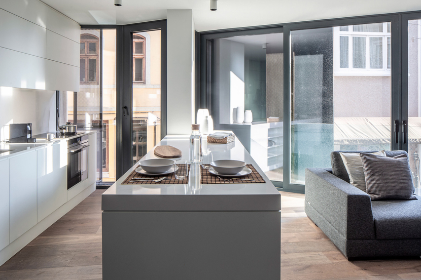 Büyük bir bölümü konut olarak kullanılan binanın iç ve dış tasarımında cam, doğal taş, ahşap ve metal yüzeyler yalın bir anlatımla bir araya gelmiş. Dış cepheye özenle yerleştirilen kayar metal paneller, hem gün ışığını istenilen şekilde kontrol edebilmek hem de apartman sakinlerinin özel alan ihtiyaçlarını en iyi şekilde karşılamak için tasarlanmış.