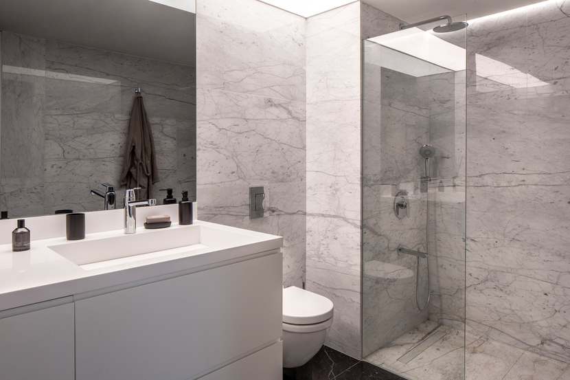 Banyo tasarımında da yine tasarımın bütününde ele alındığı gibi form, malzeme ve renk seçiminde modern, yalın ve sade yaklaşım devam ettirilmiş. Siyah, beyaz ve griden oluşan renk paleti, doğal taş, ahşap ve cam kullanılarak günümüz yaşam koşullarına uyumlu ve keyifli bir yapılı çevre oluşturmuş.