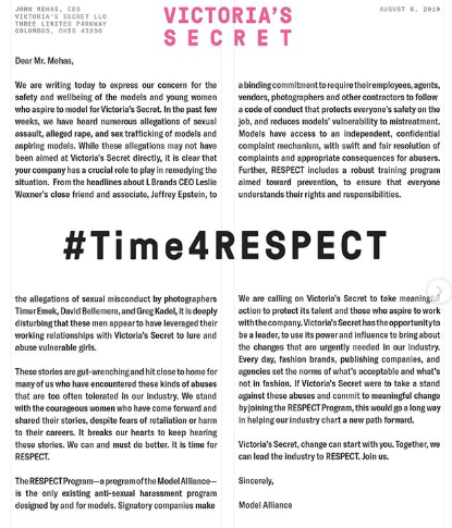 İçinde Doutzen Kroes, Christy Turlington Burns, Milla Jovaich gibi isimlerin bulunduğu 100'den fazla Victoria's Secret mankeninin altına imzasını attığı bir mektup, ünlü şirketin CEO'su John Mehas'e gönderildi. Tacizlere geçit verilmemesi ve en kısa zamanda bu tacizlerin önüne geçilmesini vurgulayan mektuba aynı zamanda birçok Hollywood yıldızı da imzasını atarak destek verdi.