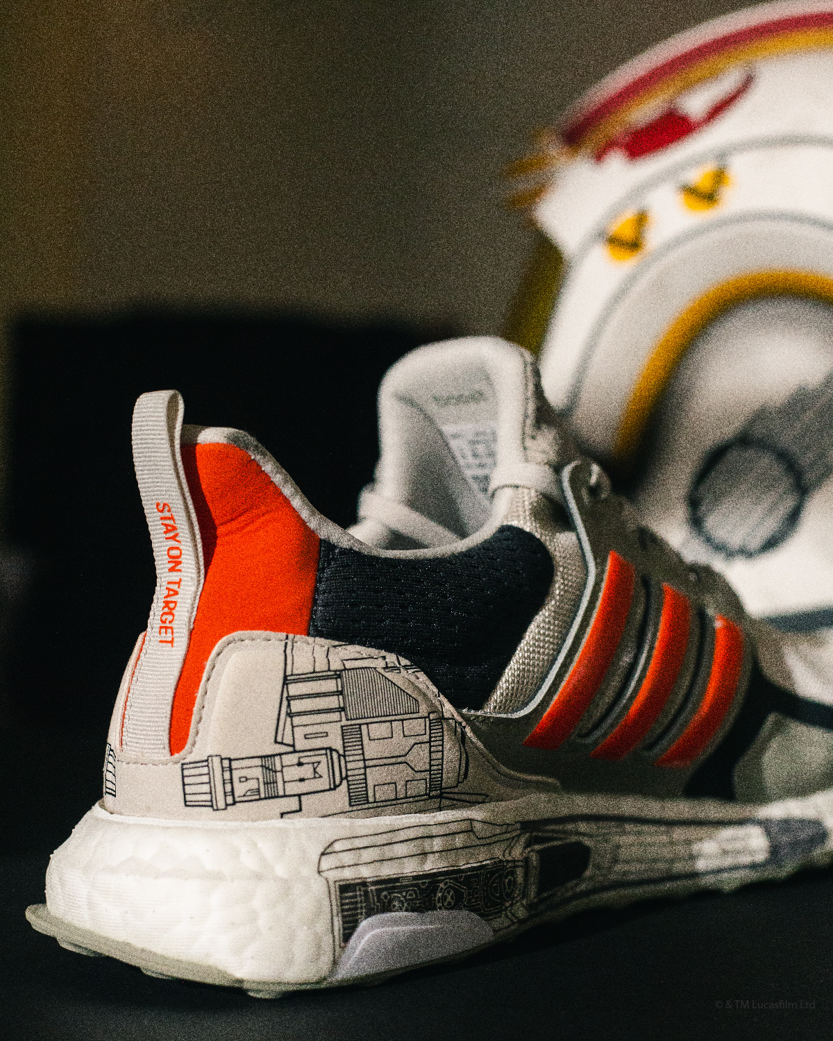 Ultraboost S&L ayakkabıları, geminin gri ve turuncu topçularını ve dış kabuğunu hatırlatan bir renk paleti ile gösteriyor. Karanlıkta parlayan unsurları, yarı parlak olarak üretilen ağı ve metalize şeritler loş ortamlarda göze çarpıyor. Deri bir kafesle örülü