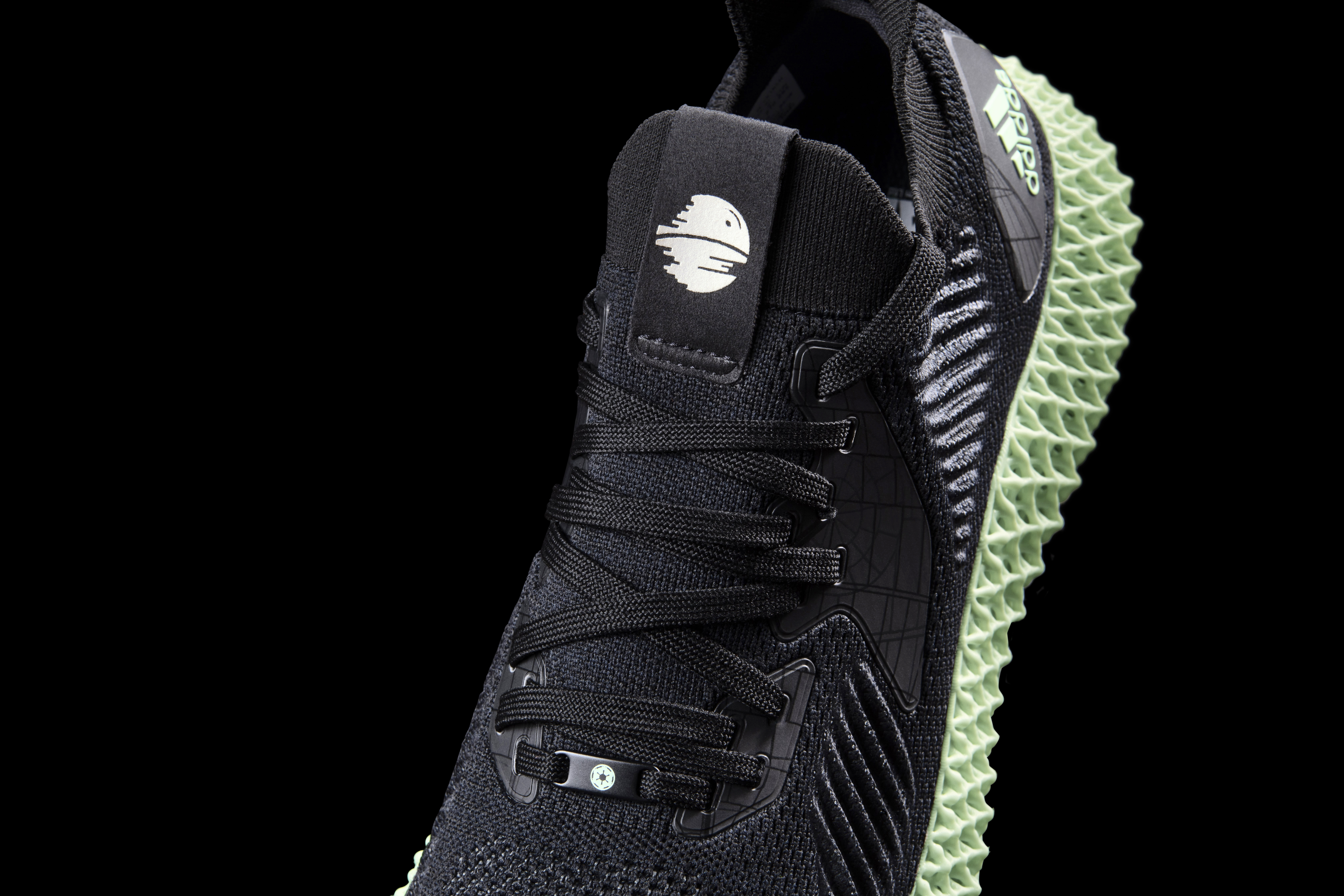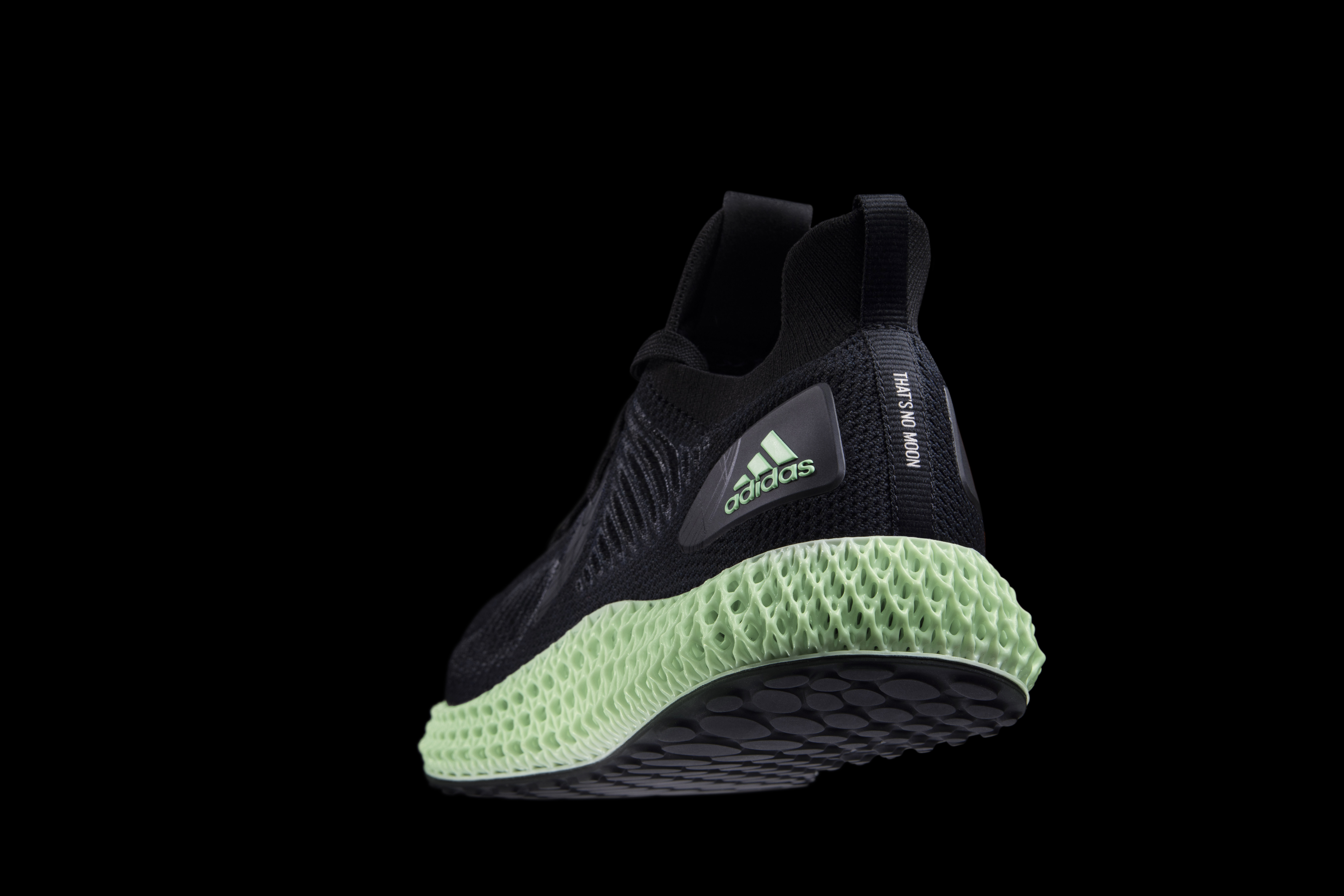 Alphaedge 4D ayakkabı. Karanlıkta parlayan unsurları, 3D baskılı 4D ayakkabı tabanına sabitlenmiş örgü ve metalik iplikli üst kısım ile bütünleştiriliyor. Stil,