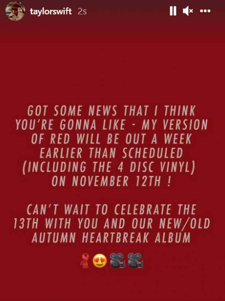 "Seveceğinizi düşündüğüm bazı haberler var - Red versiyonum (4 diskli vinil dahil)12 Kasım'da planlanandan bir hafta önce çıkacak. Sizinle ayın 13'ünü ve yeni/eski sonbahar kalp kırıklığı albümünü kutlamak için sabırsızlanıyorum."