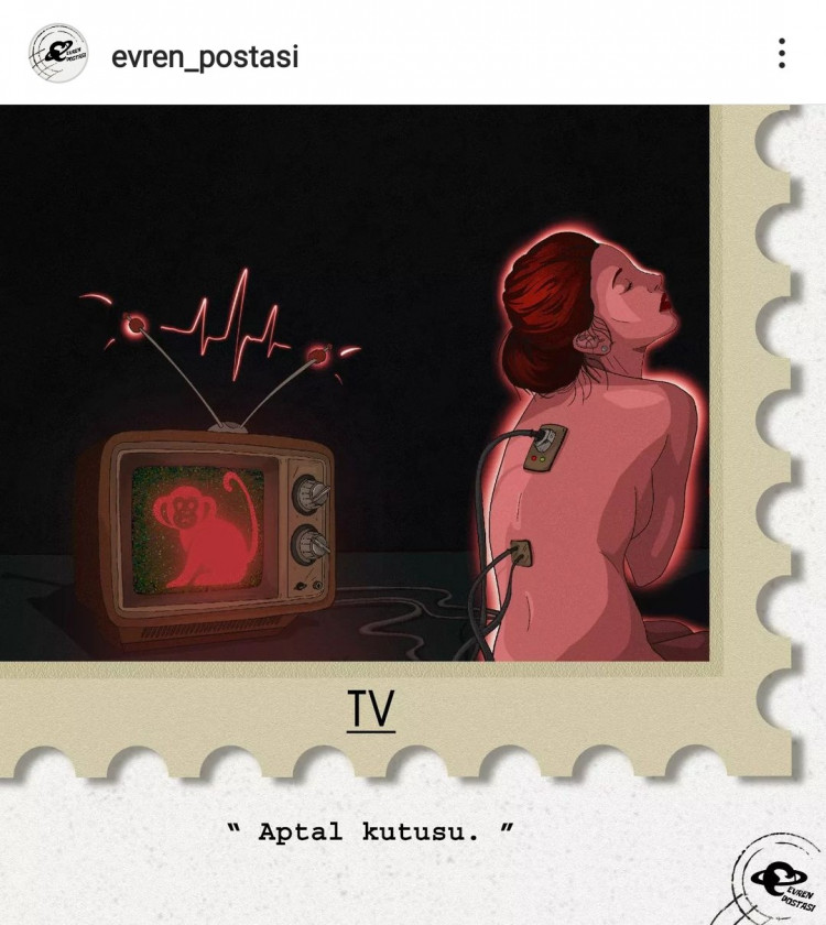 Görüntü ve sesleri aldığımız bir cihazdır dedik doğru ama teknolojinin evrildiği durumla beraber bu cihazın konumu nedir? Günümüzde her ne kadar bir çoğumuz haber almak, film izlemek, müzik dinlemek için mobil cihazlardaki internet tabanlı uygulamaları tercih ediyor olsakta televizyon hâlâ evlerin baş köşesindeki yerini koruyor. Bu da televizyonun varlığını devam etmesini sağlayan büyük köklere sahip olduğunu gösteriyor. İşte tam da bu yüzden Evren postasının 'TV' isimli bu çalışması ve oradaki kadın figürünün bağlayıcılığı bu köklere büyük bir atıfta bulunuyor.
