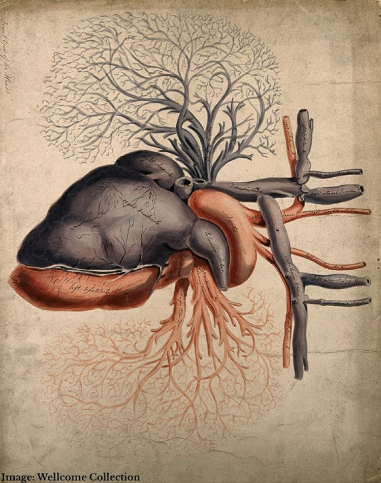 Resim, 19. yüzyılda kalbin önden görünüşü. Einthoven'dan neredeyse 100 yıl öncesi. Ama bir temel taşı önemli bir basamak, mühim bir yol gösterici. Tek tek arterlerin ve kalbin bölgelerinin adları resmin üzerine mürekkeple el yazısıyla yazılmıştır. İlmek ilmek işlenmiş bir çalışma. Kalpten çıkan damarlaşmaların tasviri hem çok başarılı hem de insana ağaç köklerine dem vuran bir yapısı var. Ağacın duruşu topraktan aldığı üç enerji bağlantı. Hayata akış yeniden başlayış... Doğanın drenajı ve doğanın içimizdeki şarkısı...