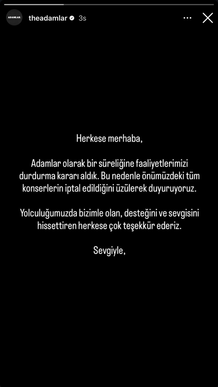 Adamlar olarak bir süreliğine faaliyetlerimizi durdurma kararı aldık. Bu nedenle önümüzdeki tüm konserlerin iptal edildiğini üzülerek duyuruyoruz. Yolculuğumuzda bizimle olan, desteğini ve sevgisini hissettiren herkese çok teşekkür ederiz. Sevgiyle.” ifadelerine yer verildi.