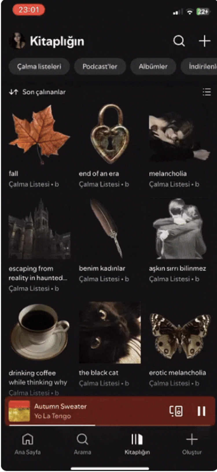 listemizi oluşturduk, peki şimdi ne yapacağız. kapak resmine bir yaprak koyacağız ve diğer listelerimizin kapaklarına da mumlar, sararmış yapraklar, büyülü mimariler. dur bekle. senin spotify'ına da sonbaharı getireceğim.