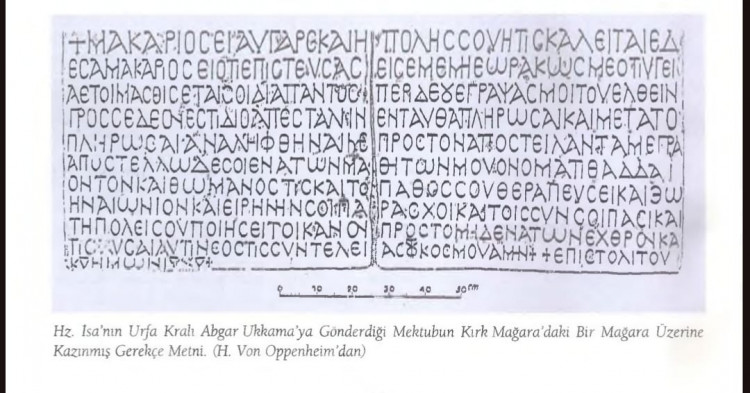 [Hz. İsa'nın mektubunun Grekçesi Urfa’nın Kırkmağara köyündeki bir mağaranın girişinde kaya zeminine işlenmiş olarak bulunmuş, Mektup 1914 yılında H. Von Oppenheim tarafından tespit edilerek yayınlanmıştır. Mektupta şöyle yazmaktadır: