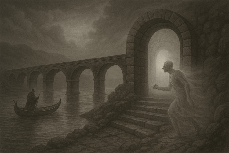 Ruh yolculuğunun en evrensel motiflerinden biri nehir geçişidir. Antik Yunan’da Styx nehri, ruhla yaşayan dünya arasındaki sınırdır. Ruh, Kharon’un kayığıyla nehrin karşı kıyısına geçmeden Hades’e adım atamaz. Benzer bir anlayış, Mezopotamya metinlerinde ve hatta Orta Asya mitlerinde de göze çarpar. Su, iki dünya arasındaki arındırıcı perde olarak kabul edilir: canlılık dünyası suda çözünür, ruh karşıya salt bilinç olarak geçer.