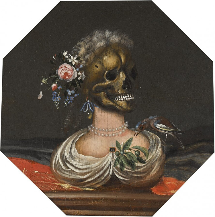 Catarina Ykens’te saklanacak pek bir alan kalmaz; anlatı nettir ama sertlik taşımaz, aristokrat bir kadının yüzü yerini bir kafatasına bırakırken çiçekler hala kompozisyonda kalır, süs dili sürer ama anlam yer değiştirir ve zarafet, statü ile ayrıcalık askıda kalır; yüz ortadan kalktığında ise geriye kalanla baş başa kalınır.