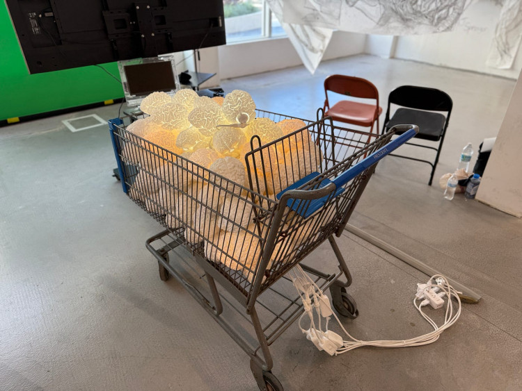 Inside pink televisions, we see the reflected faces of viewers captured by cameras [26:17]. Fabiola Larios’ Surveillance Cutie disguises surveillance under a cute, sparkling aesthetic. Featuring bedazzled vintage TVs and security cameras, a child mannequin in a pink dress, reflective Mylar surfaces, and a heart–patterned rug, the installation creates an atmosphere that is simultaneously adorable and unsettling. By merging hyper–feminine imagery and nostalgic technology, the artist hides the discomfort of constant surveillance beneath the veneer of innocence. Viewers, both reflected and recorded, become part of the experience; prompted to question how sweetness and beauty can serve as tools of control. At its core, the work comments on privacy, vulnerability, and the performative nature of identity in the digital age. In a time when people ignore surveillance cameras yet obsess over recording themselves with more visible ones, it’s a striking piece. The debate over consent has, after all, brought even street photography to the brink of extinction.