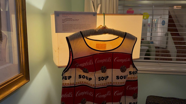 At Pia Gallo LLC, the 1966/67 Campbell Soup Company Souper Dress [22:01], made of cellulose/cotton paper, of course recalls Andy Warhol; and it would not be wrong to say it was produced in his honor. His Soup Can works from 1961 and after likely come to mind. Viewers outside the U.S. may not realize how often this soup appears in daily life, they may think it’s a fictional product [I know a few people thoughts that for real]. To summarize: sometimes supermarket soup aisles look like an art fair unto themselves. Although Warhol’s practice is far deeper, he suffered what many popular artists experience: an artwork series becomes fused with their identity, sticking to them inescapably. The label at the fair explained that Pop Art is not a movement defined by a manifesto but a cultural sensibility and aesthetic that emerged in the 1950s and expanded in the 1960s; that artists like Warhol blurred boundaries between art and everyday life through works referencing advertising icons, cartoons, and billboards; that the fashion world embraced the spirit of Pop Art, accelerating its spread; and that disposable paper dresses produced particularly in 1966–67 exemplified the merging of art and commercial consumer culture.