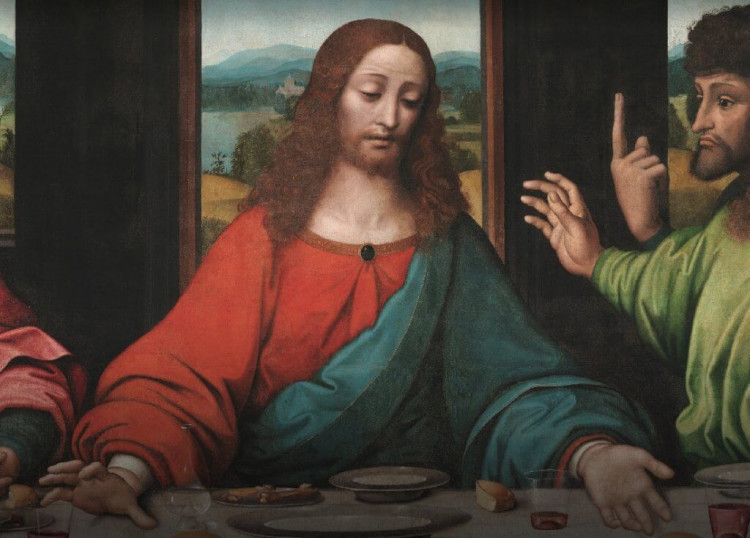 •İsa, merkezde, bilinen kutsal dinginlikle; ellerinin yönelişi ekmek ve şaraba, dolayısıyla ritüelin anlamına vurgu yapar.