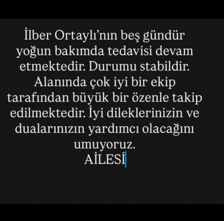 Ortaylı’nın ailesi, sosyal medya üzerinden yaptıkları paylaşımda ünlü tarihçinin tedavisinin devam ettiğini ve alanında çok iyi bir ekip tarafından büyük bir özenle takip edildiğini söyledi.