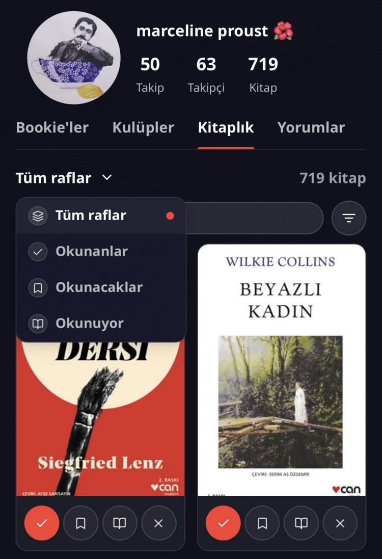 Kitaplarınızı kaydedebileceğiniz bir kitaplık rafına yer verilmiş üstelik; tek eksiği okuma tarihlerinin eklenememesi bence. Bunun dışında okuduklarınız ve okumaya devam ettikleriniz, puanlarınız ve yorumlarınız gibi çok detaylı alanlar bulunuyor.