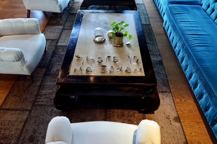 This work, constructed through the bending of spoons, had previously been exhibited in various galleries with different [generally plain] backgrounds. In this iteration, in order to both create a photographic composition and turn contextual slippage into a mischievous experience, the manipulated objects were taken back into a restaurant/lounge setting where spoons belong, and the photograph was produced there. What emerges is a liminal state in which the object is both an artwork and not, both a restaurant utensil and not, an in–between condition. When you see the word 'spoon' in the label, you assume the work consists of form–altered objects, and that the surrounding composition serves it in ways you may or may not recognize. While the category may appear to be knowledge, it is in fact time. In all periods where The Matrix and its discourse are not understood, the work becomes inoperative.