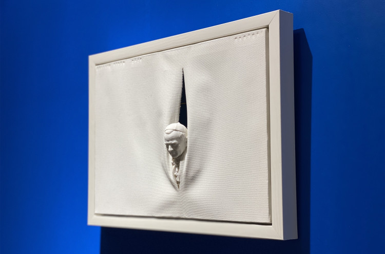 This work, held in the personal collection of the founder of one of Turkey’s most prominent contemporary art museums, consists of a papal bust I acquired in Rome, emerging from the center of a torn canvas. On a more intuitive level, the work [one of those requiring minimal explanation] often immediately evokes in the viewer a critical stance on the domination of religion over the female body. The addition of a cross around the bust’s neck, along with the visible skullcap, allows almost anyone, even with minimal knowledge, to recognize it as a religious figure. The title, referencing the Pope, establishes a direct semantic link within the explanatory framework.