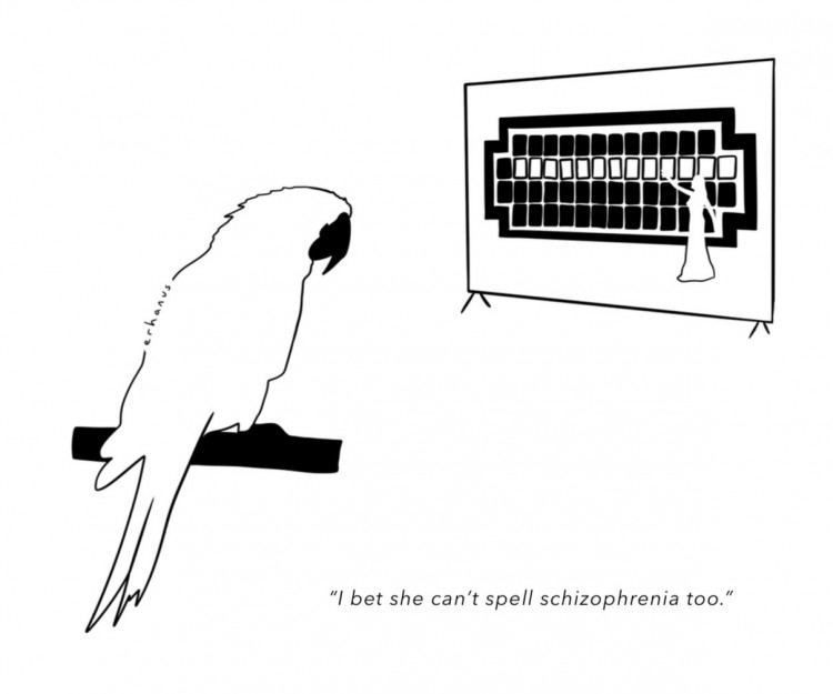 In this illustration from my third book Overestimation, a caricature is constructed around 'schizophrenia', one of the most difficult words in English to write, read, and syllabify. It may evoke associations for those fluent in the language or familiar with this detail, while remaining meaningless to others. The context here is epistemic [requiring knowledge of linguistic nuance] and simultaneously geographical, due to the regions in which the language is used. Such intersections complicate categorization, at times rendering it nearly impossible; thus, basic segmentation often proves most functional.