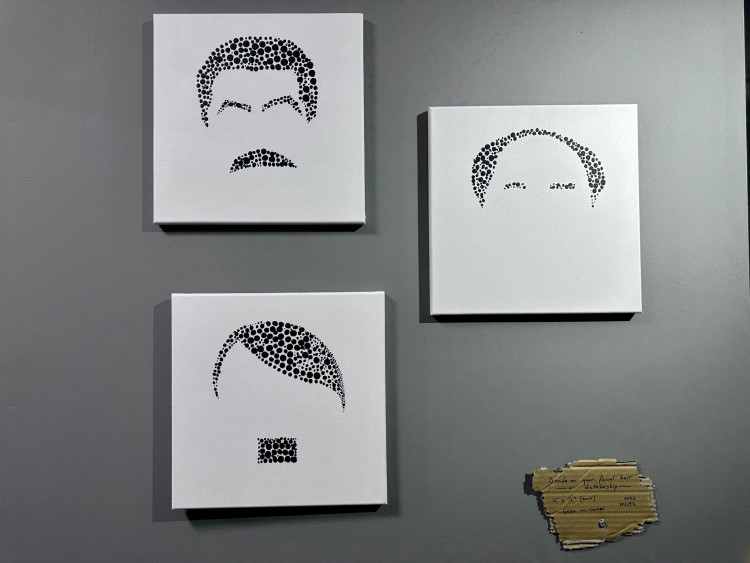 Pointillist portraits of Adolf Hitler, Joseph Stalin, and Mao Zedong. Had the work been titled 'Untitled', the viewer would project their own interpretive framework, effectively discarding the artist’s intended causality and context. The explicit inclusion of the word 'dictatorship' in the title clearly positions the artist, leaving no ambiguity.
