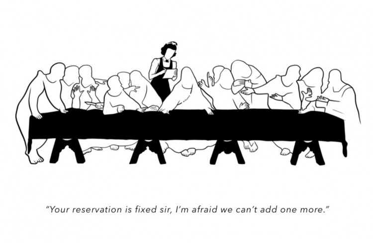A drawing that clearly references The Last Supper, featuring a waitress interacting with a Christ figure. It invokes the narrative of the 13 apostles, engaging contexts of knowledge, time, and partially era. Religious figures [sadly due to their historically oppressive growing dynamics] generate some of the most universally shared visual associations.