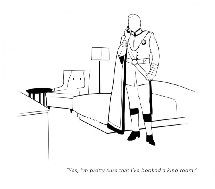 The phrase 'king room' is interpreted here literally as a room allocated to a king [completed with costume]. The function of satirical caricature is not necessarily to provoke laughter, but to stimulate thought [perhaps eliciting only a subtle smile]. Often employing dark humor, its aim is to draw attention to a subject or provoke reflection. At times, it also prompts the viewer to question their immediate reality and knowledge. Had the wordplay between 'king' and its translations in different languages [if the room type named differently], the visual might not have been perceived as humorous.